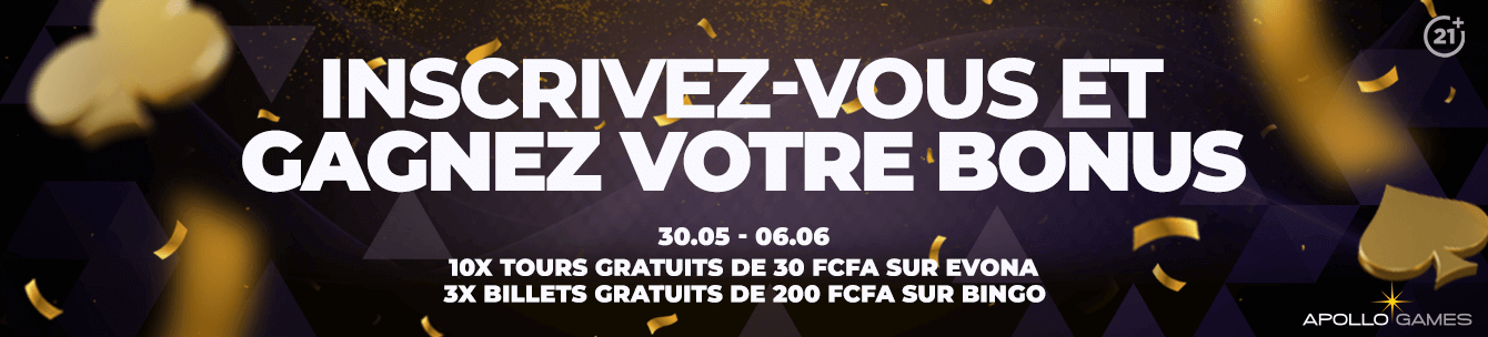 ApolloGames offre 3x 200CFA PARI GRATUIT BINGO et 10x TOURS GRATUITS sur les jeux de casino EVONA à TOUTE PERSONNE qui s’inscrit entre le 30.05.2024 à 00h01 et le 06.06.2024 à 23h59.
