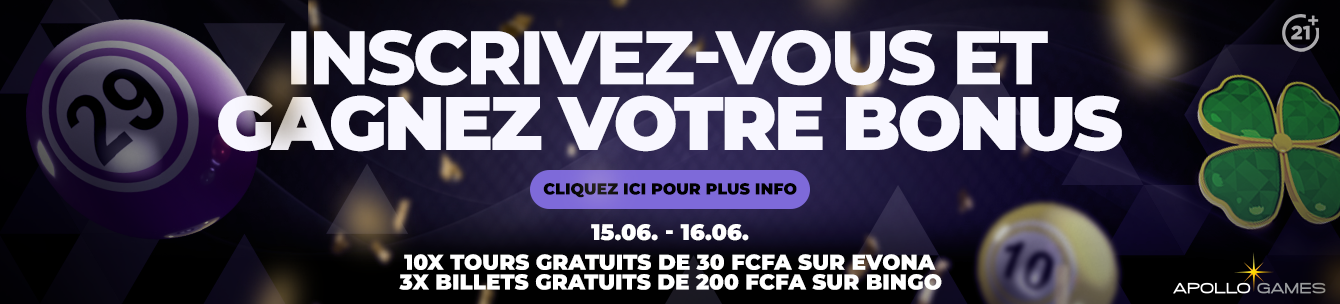 ApolloGames offre 3x 200CFA PARI GRATUIT BINGO et 10x TOURS GRATUITS sur les jeux de casino EVONA à TOUTE PERSONNE qui s'inscrit entre le 15.06.2024 ...